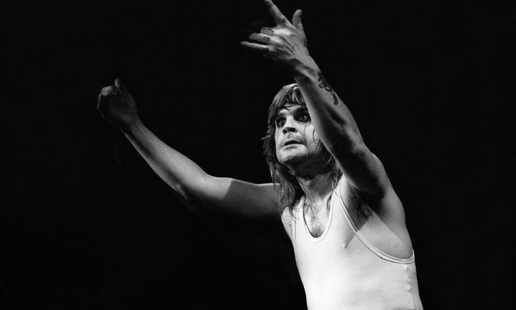 Osbourne stretches his arms under dim lights during Black Sabbath early UK shows, 1970, a defining image of early heavy metal theatrics.