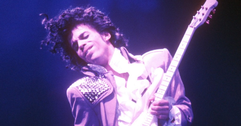 Prince kneels under a spotlight during the Purple Rain Tour, 1984, dressed in lace and ruffles, blending theatricality with precise musicianship.