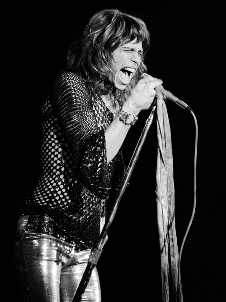 Tyler leans, mouth open mid-scream, mic wrapped in scarves, in late 1970s performances, one of Aerosmith’s most recognizable stage images.