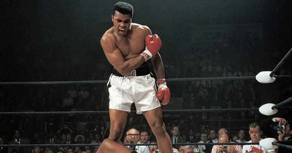Ali’s triumphant pose immediately after a knockout was perfectly timed to symbolize dominance and charisma.