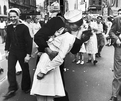 A spontaneous kiss celebrating the end of WWII captured at exactly the right moment, pure serendipity.