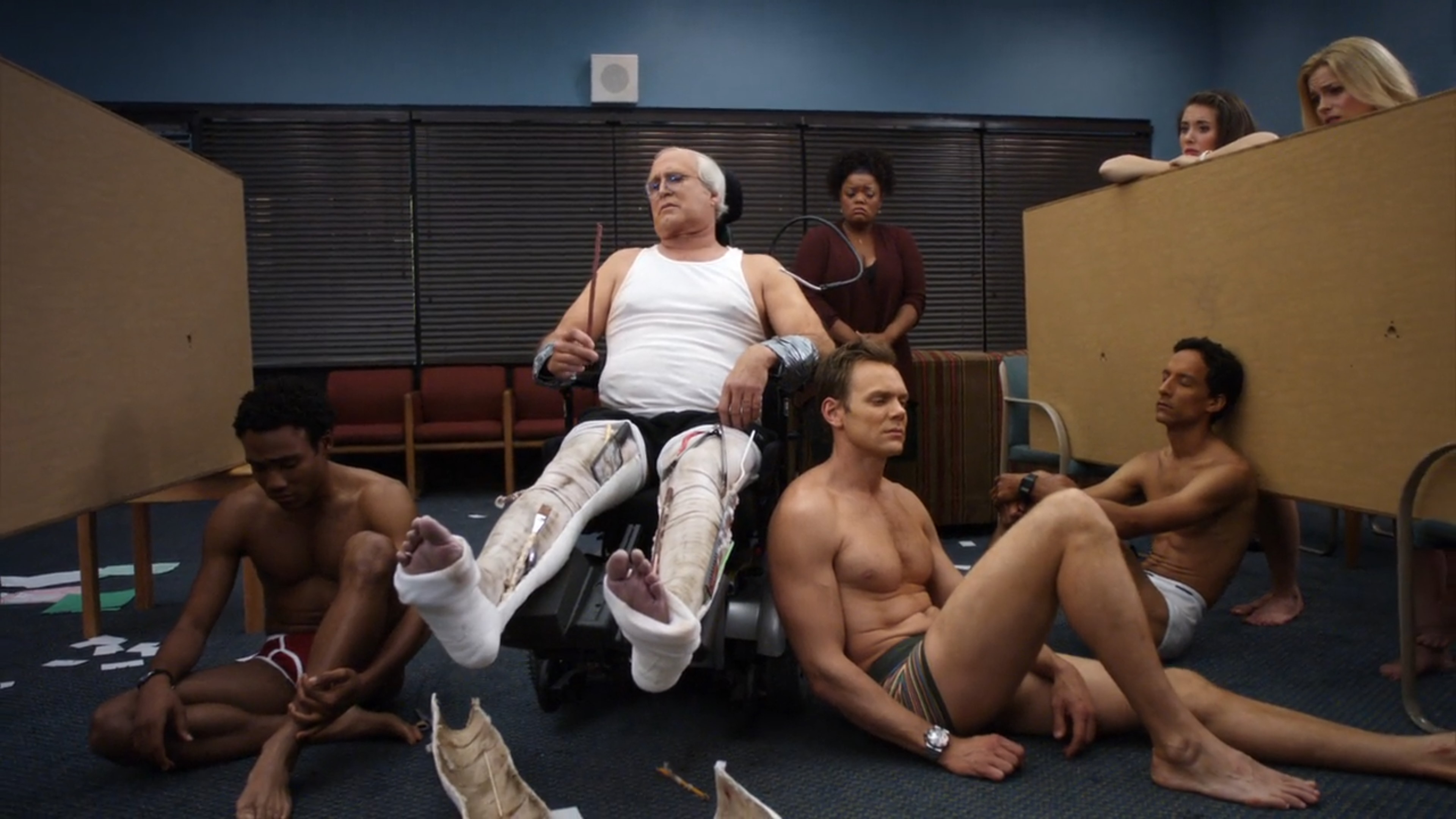 As mentioned, Chevy Chase had an unceremonious exit from the series during the previous season and Harmon felt it needed to be addressed, so he dies offscreen and then, in this episode, a lawyer played by Walton Goggins gathers the study group together to read Pierce’s will. It’s interesting to see how the show deals with having to suddenly write the character out without having Chevy Chase around to film a proper ending for him and they do a decent job of it. It’s also a reprise of season two’s classic bottle episode, as the gang stays in the study room the whole time.